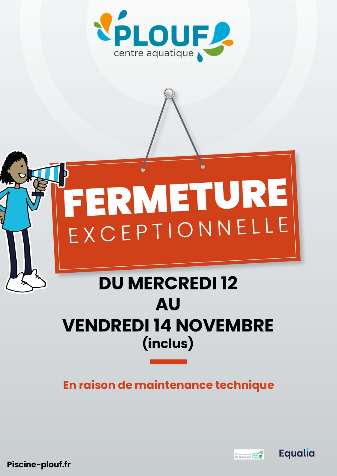 Le centre aquatique Plouf sera fermé du mercredi 12 novembre au vendre 14 novembre inclus en raison de maintenance technique 🛠